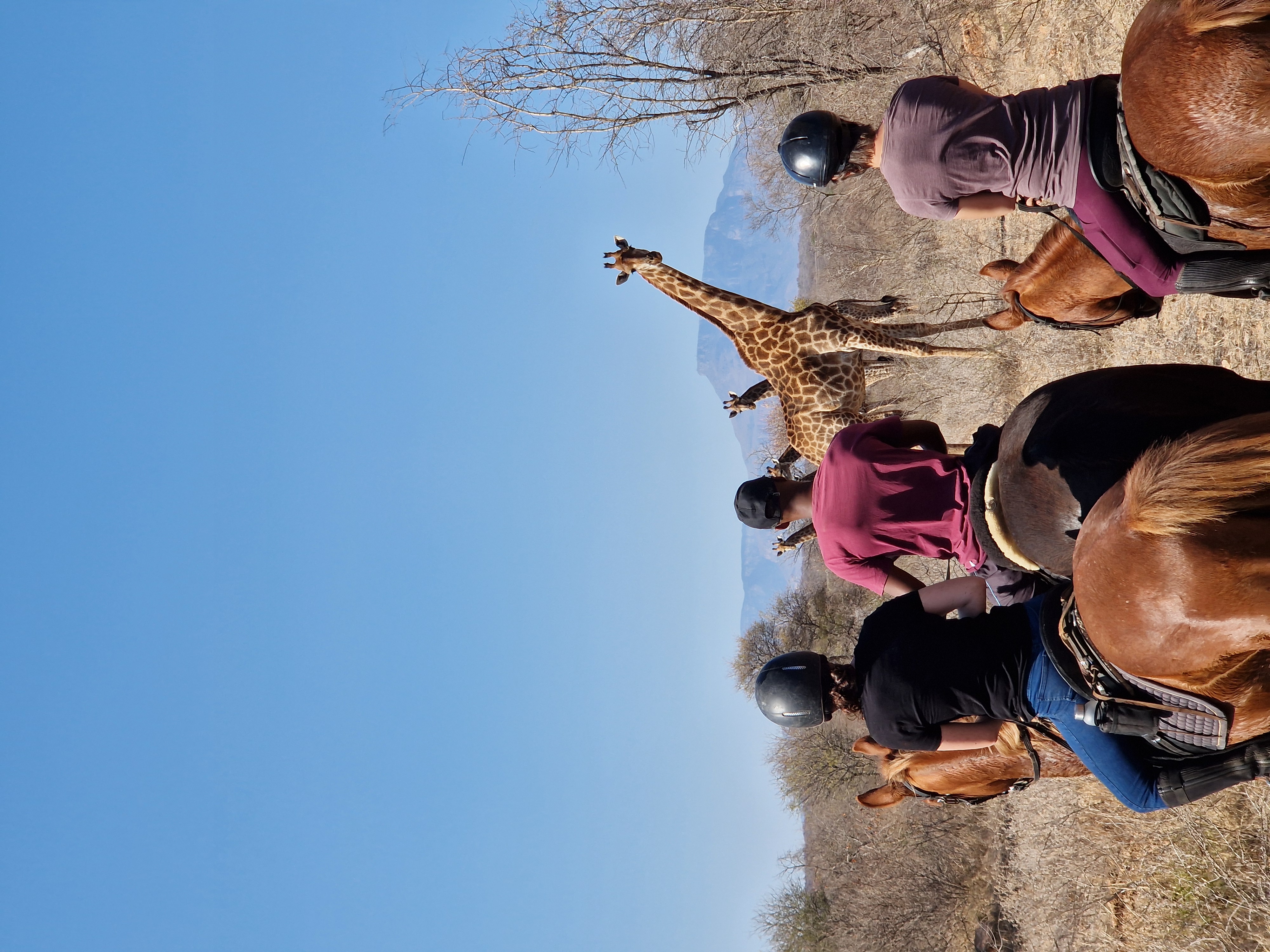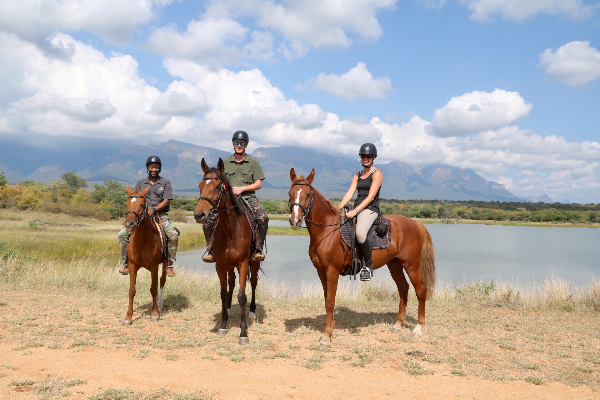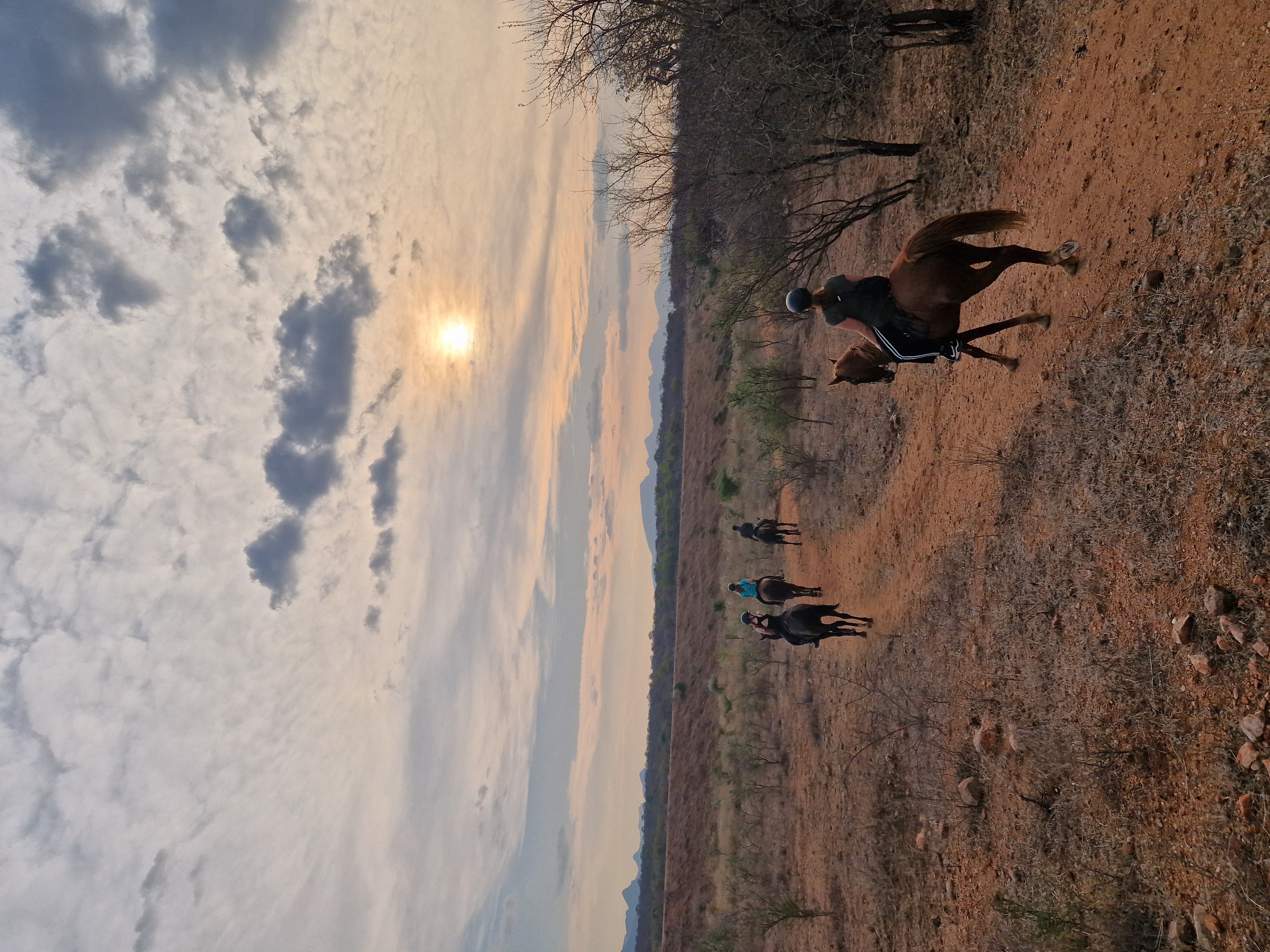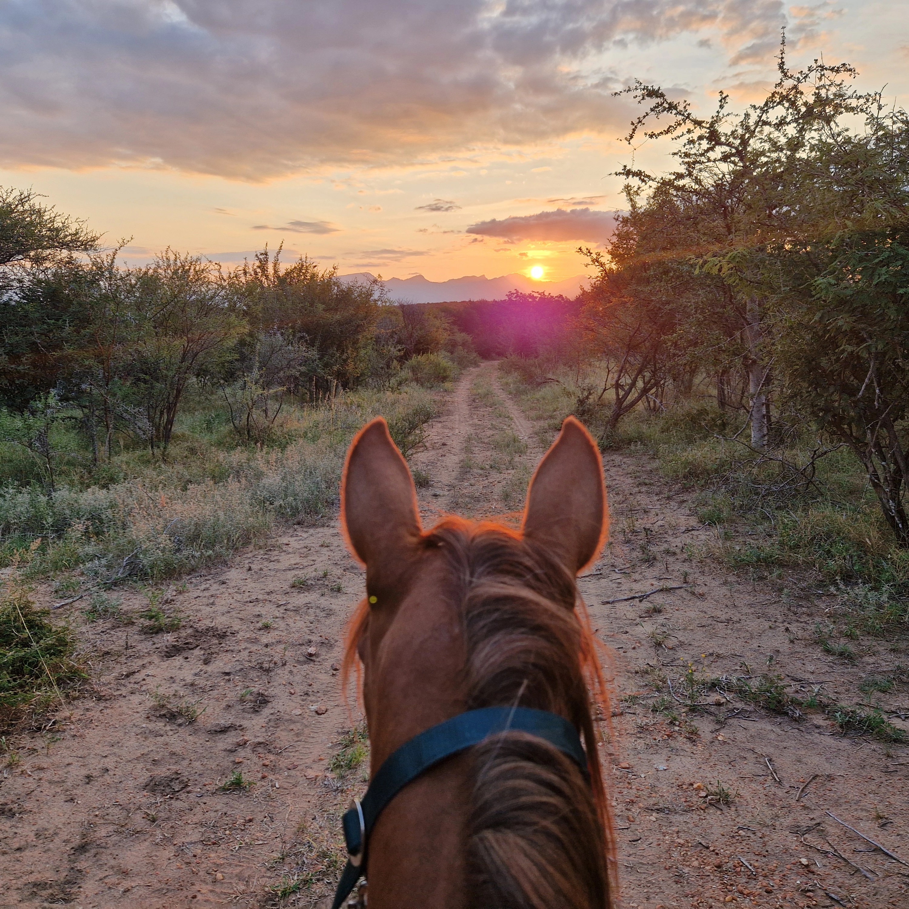 Je rijdt dagelijks ongeveer 3 tot 5 uur, afhankelijk van het weer, door een zeer afwisselend landschap van mooie zandpaden, open savannes, rivieroevers en boomgaarden met citrusbomen. Onderweg zie je de wilde dieren, waaronder giraffen, zebra's, kudu's, struisvogels, gnoes, waterbokken, nyala, impala, wilde zwijnen, nijlpaarden en krokodillen. Er wordt gereden op zowel het eigen terrein als de omliggende terreinen, in totaal zo'n 1000 hectare aan natuur. Meestal maak je een ochtendrit van circa drie uur en een kortere rit van ongeveer twee uur in de middag, met volop mogelijkheden om te galopperen. Je zadelt en verzorgt je paard zelf voor en na de rit. Tijdens je verblijf rijd je op verschillende paarden. Eén keer per week wordt er een rit georganiseerd die wordt afgesloten met een drankje bij zonsondergang.