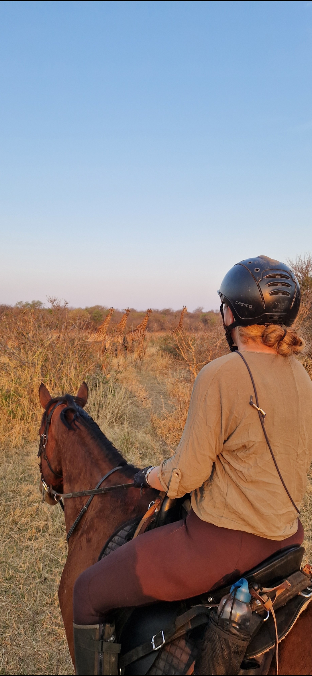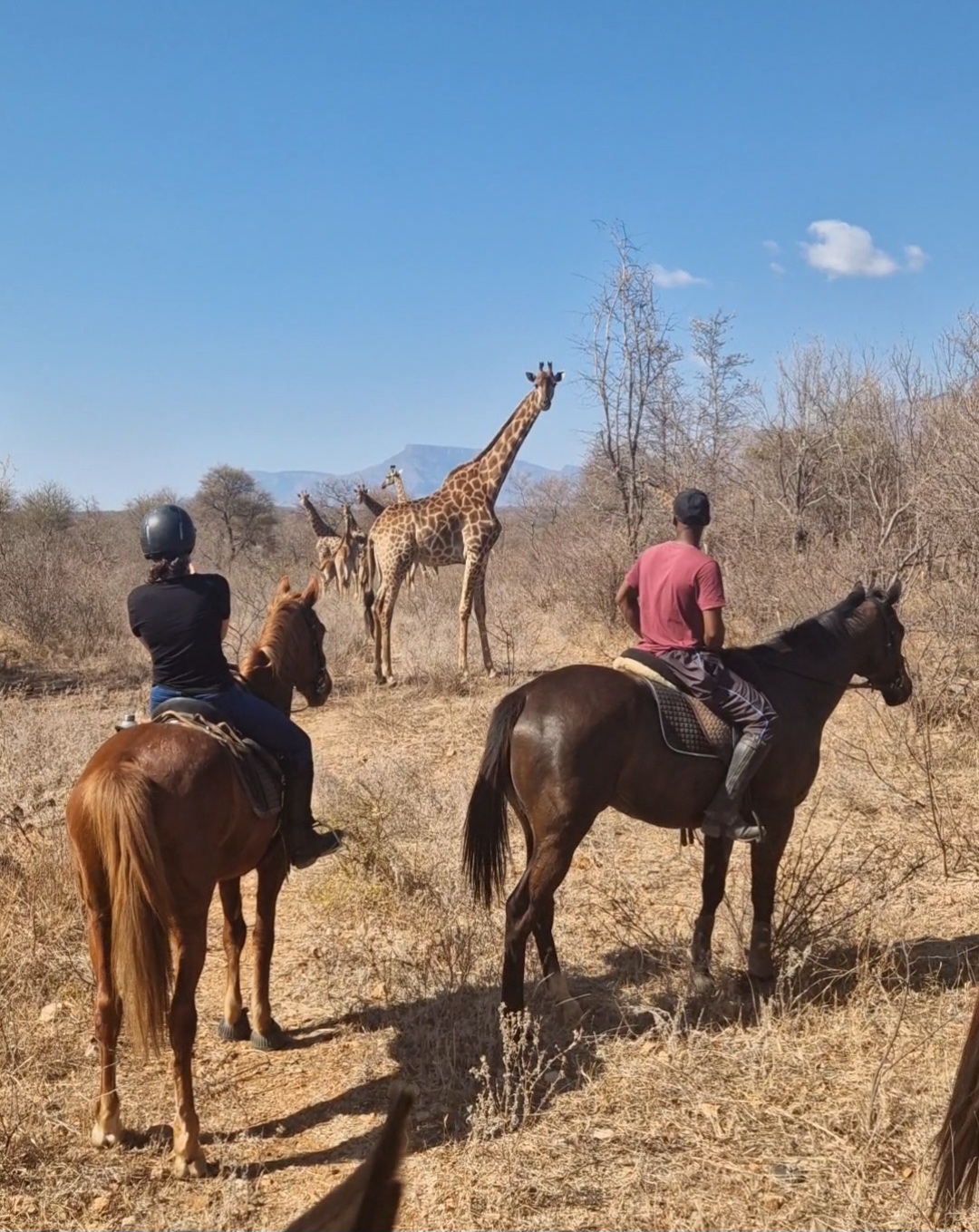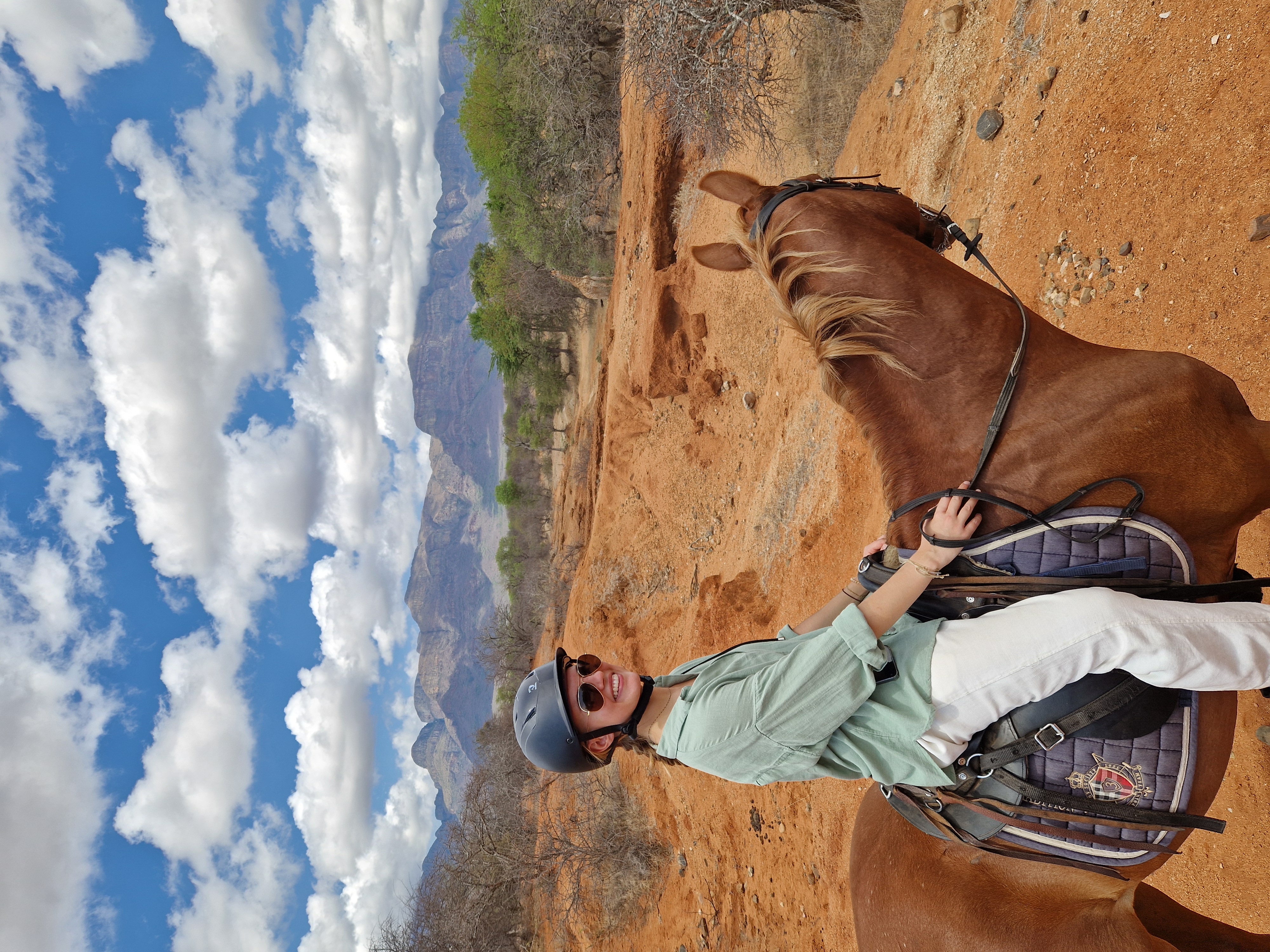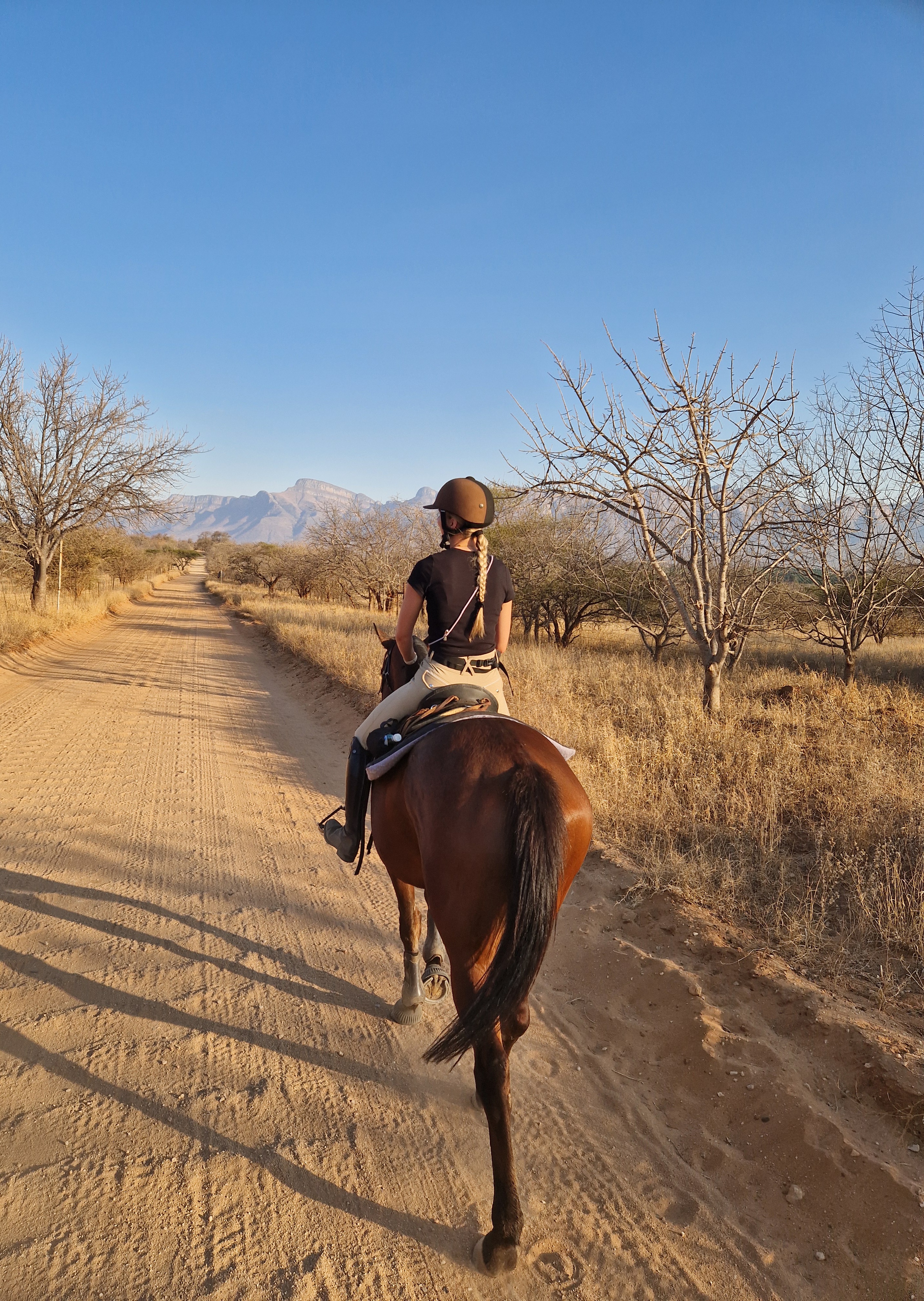 Je rijdt dagelijks ongeveer 3 tot 5 uur, afhankelijk van het weer, door een zeer afwisselend landschap van mooie zandpaden, open savannes, rivieroevers en boomgaarden met citrusbomen. Onderweg zie je de wilde dieren, waaronder giraffen, zebra's, kudu's, struisvogels, gnoes, waterbokken, nyala, impala, wilde zwijnen, nijlpaarden en krokodillen. Er wordt gereden op zowel het eigen terrein als de omliggende terreinen, in totaal zo'n 1000 hectare aan natuur. Meestal maak je een ochtendrit van circa drie uur en een kortere rit van ongeveer twee uur in de middag, met volop mogelijkheden om te galopperen. Je zadelt en verzorgt je paard zelf voor en na de rit. Tijdens je verblijf rijd je op verschillende paarden. Eén keer per week wordt er een rit georganiseerd die wordt afgesloten met een drankje bij zonsondergang.